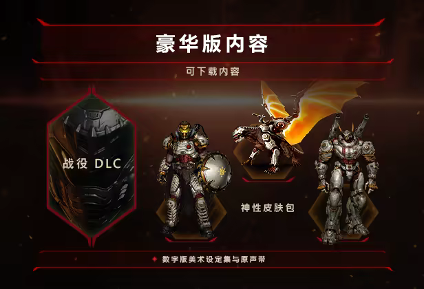 入手豪华版升级*,奋起战斗,内容包括战役 DLC**、数字版美术设定集与原声带,还有神性皮肤包,内含毁灭战士、巨龙和亚特兰机甲的专用皮肤。