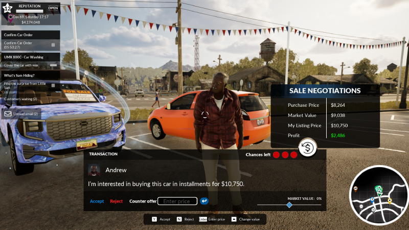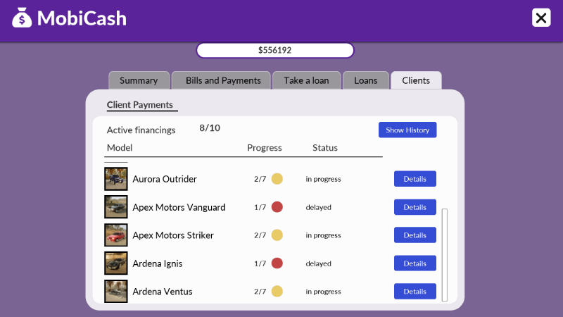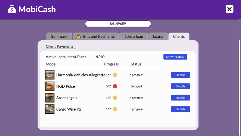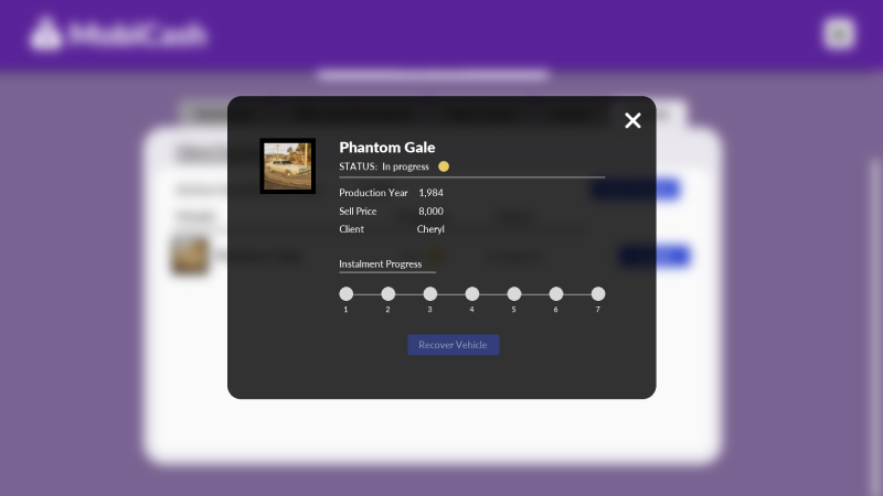 Some customers will ask about buying a vehicle in installments. If you agree, you will be able to track the progress in the app. Payments are split into 7 installments - one per in-game day.