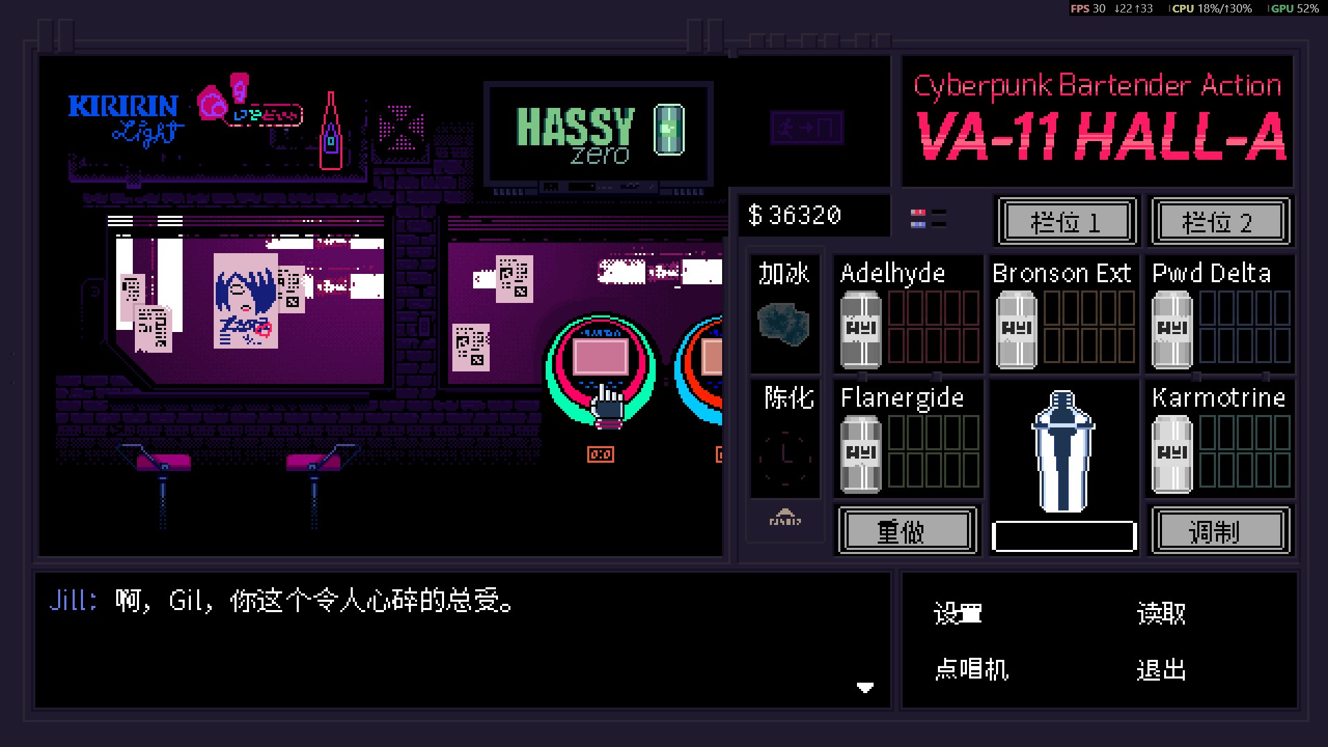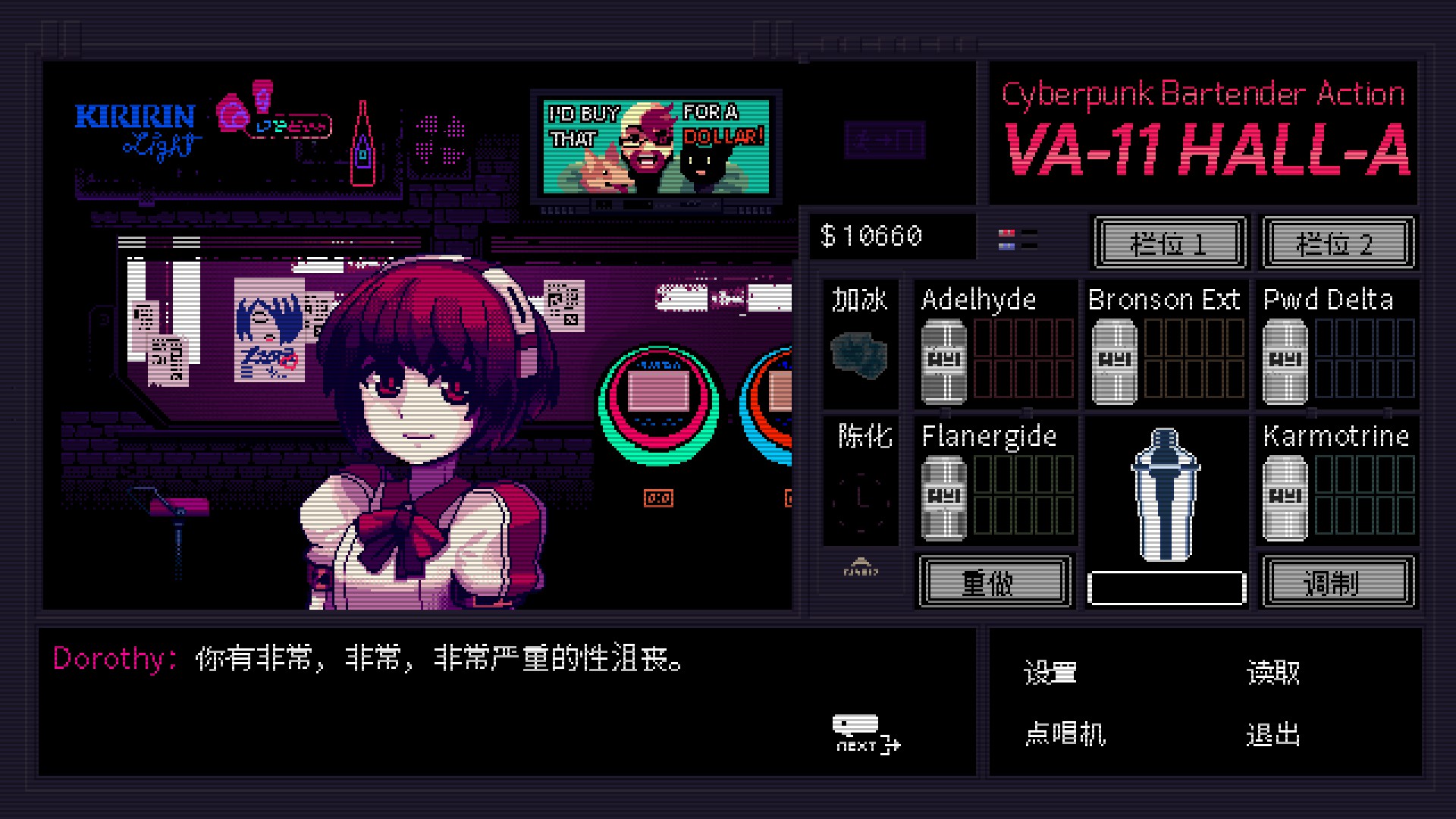 VA-11 HALL-A: Cyberpunk Bartender Action is a booze em' up about waifus, technology, and post-dystopia life.