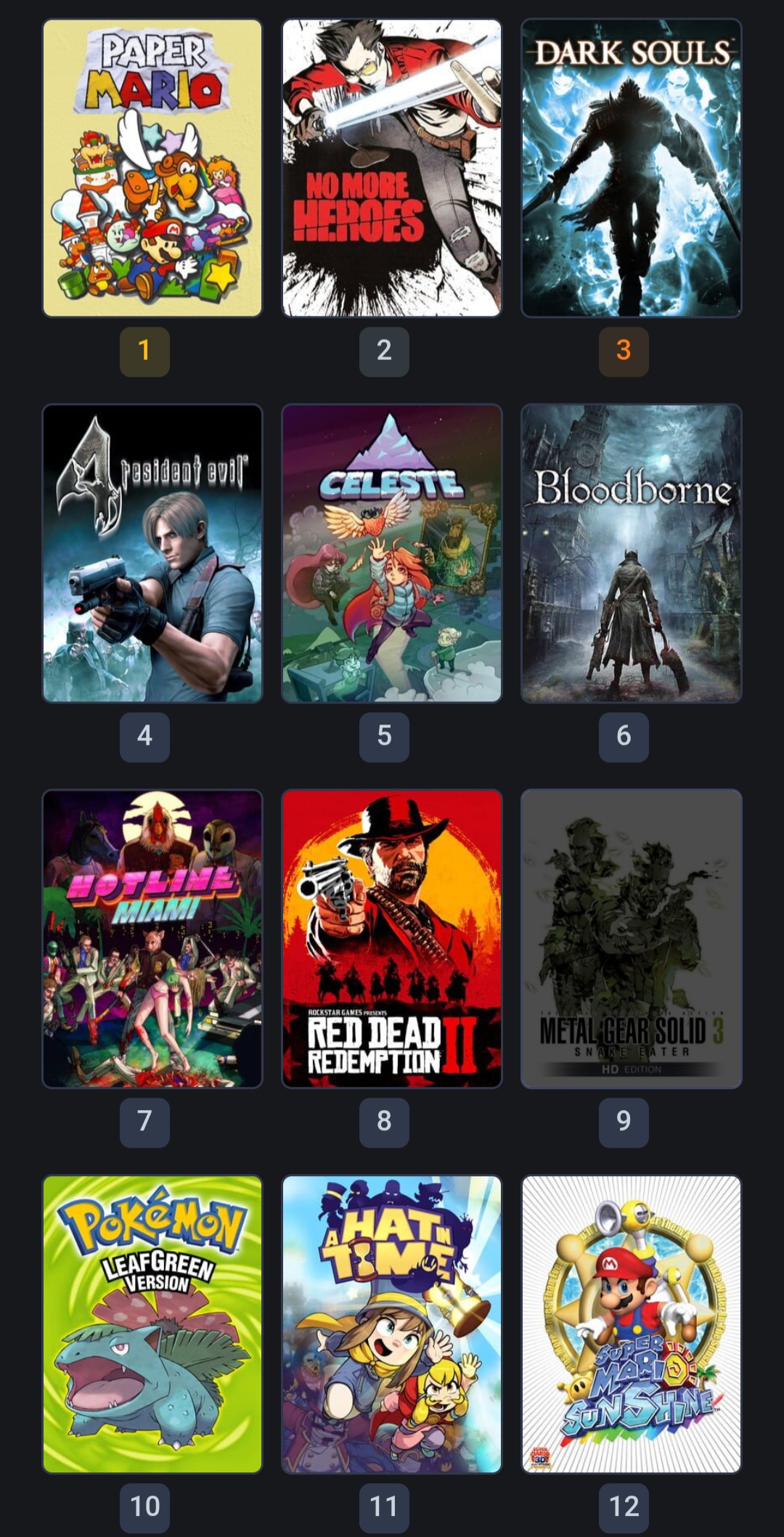 -Favorite games of all time include Paper Mario, No More Heroes, Dark Souls, Resident Evil 4, Celeste, Bloodborne, Hotline Miami, Metal Gear Solid 3, A Hat in Time, Red Dead Redemption 2, and Pokemon Leafgreen